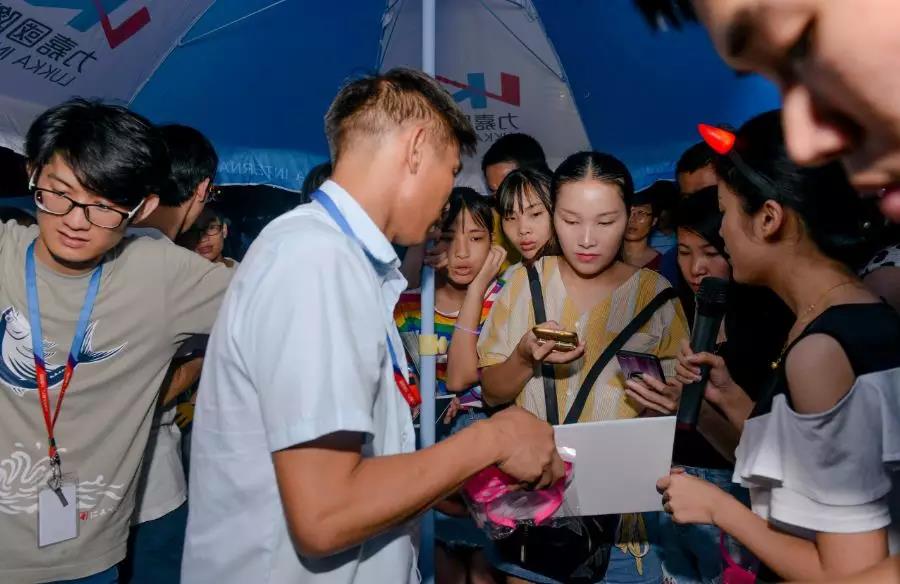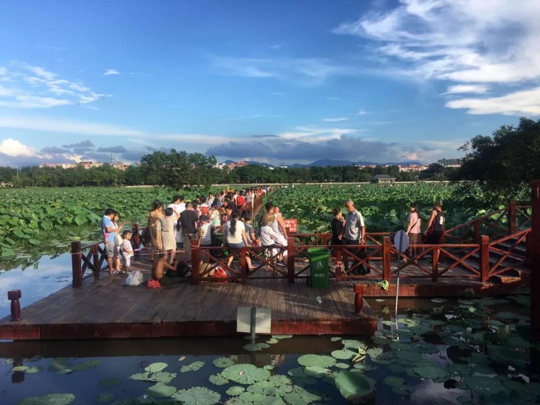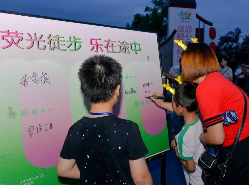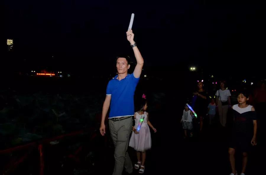 晚上七點,夜幕籠罩,舉辦的“熒光徒步 樂在途中”大受熱捧,游客們排起長龍領取徒步七彩發光海綿熒光棒、發光牛角箍、發光眼鏡等,歡笑聲、音樂聲陣陣于耳,再次將此次活動推向了高潮,讓附近居民在盡賞蓮湖荷花的迷人景致之余,盡享徒步樂趣。
