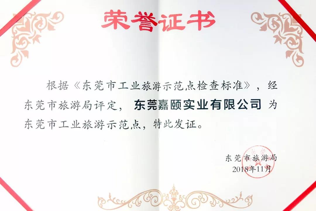 前期經企業自評、鎮街旅游管理部門初評和市旅游局檢查驗收,擬定東莞市8家企業為東莞市工業旅游示范點,力嘉國際集團旗下的東莞嘉頤實業有限公司榮耀登榜。2018年11月24日上午,中國(虎門)國際服裝交易會在虎門會展中心隆重啟動,現場還將進行2018東莞市工業旅游示范點頒獎儀式,東莞市黎軍副市長、虎門鎮劉杰書記、市旅游局董紅局長、虎門鎮鄧衛洪鎮長出席了本次活動。