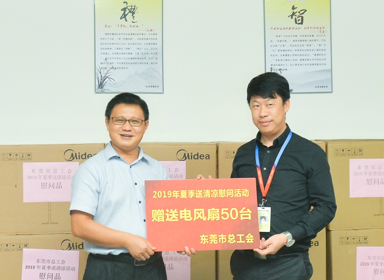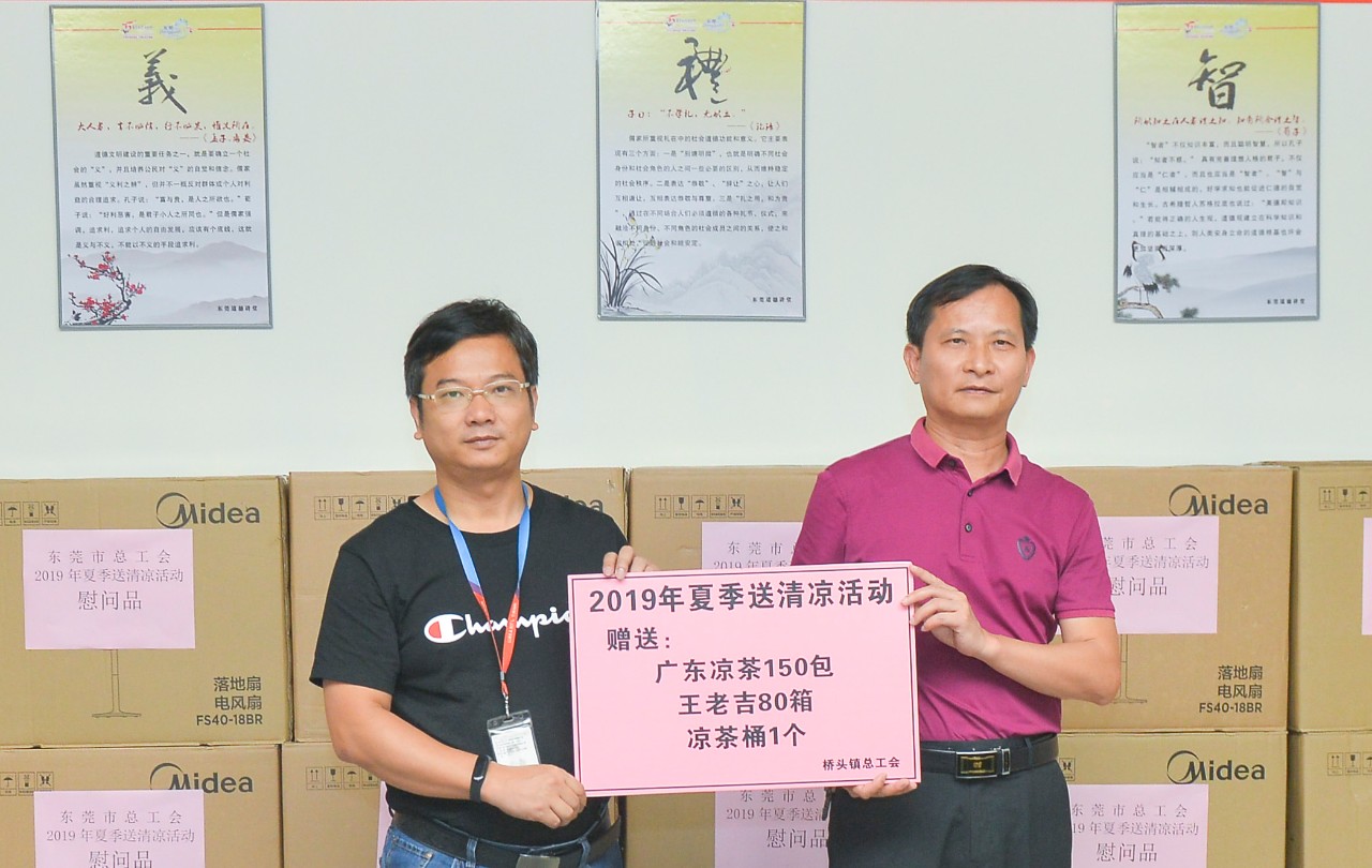 隨后,東莞市總工會副主席何志雄,橋頭鎮(zhèn)人大副主席、總工會主席鄧沃輝為力嘉集團頒發(fā)慰問牌匾,包含落地電風(fēng)扇50臺、清涼飲料80箱、廣東涼茶150包、涼茶桶1個。